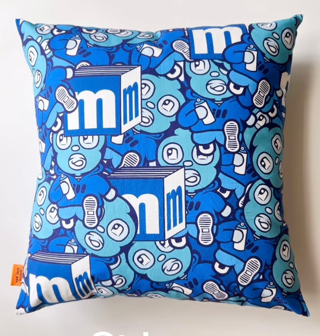 コラージュされたキャラクターが大きめの 45×45cmのクッションです。 生地と圧縮された中身が送られます。